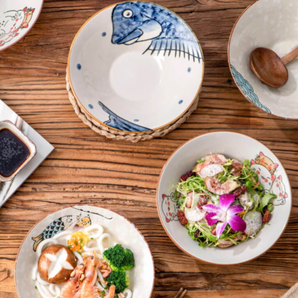£19.99 inc VATLarge Ceramic Ramen Bowl Blue Fish Japanese Noodles Bowls Dinner Sets for Pasta Soup Pho Mixing Salad Dishes Snack Cereal with Spoon Chopsticks 900ml-Set of 2