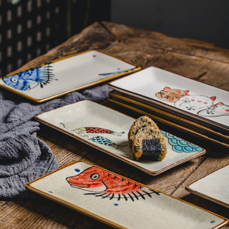 Japanese Style Fortune Cat Fish Style Ceramic Sushi Serving Platter Rectangular Sushi Plate-Set of 4